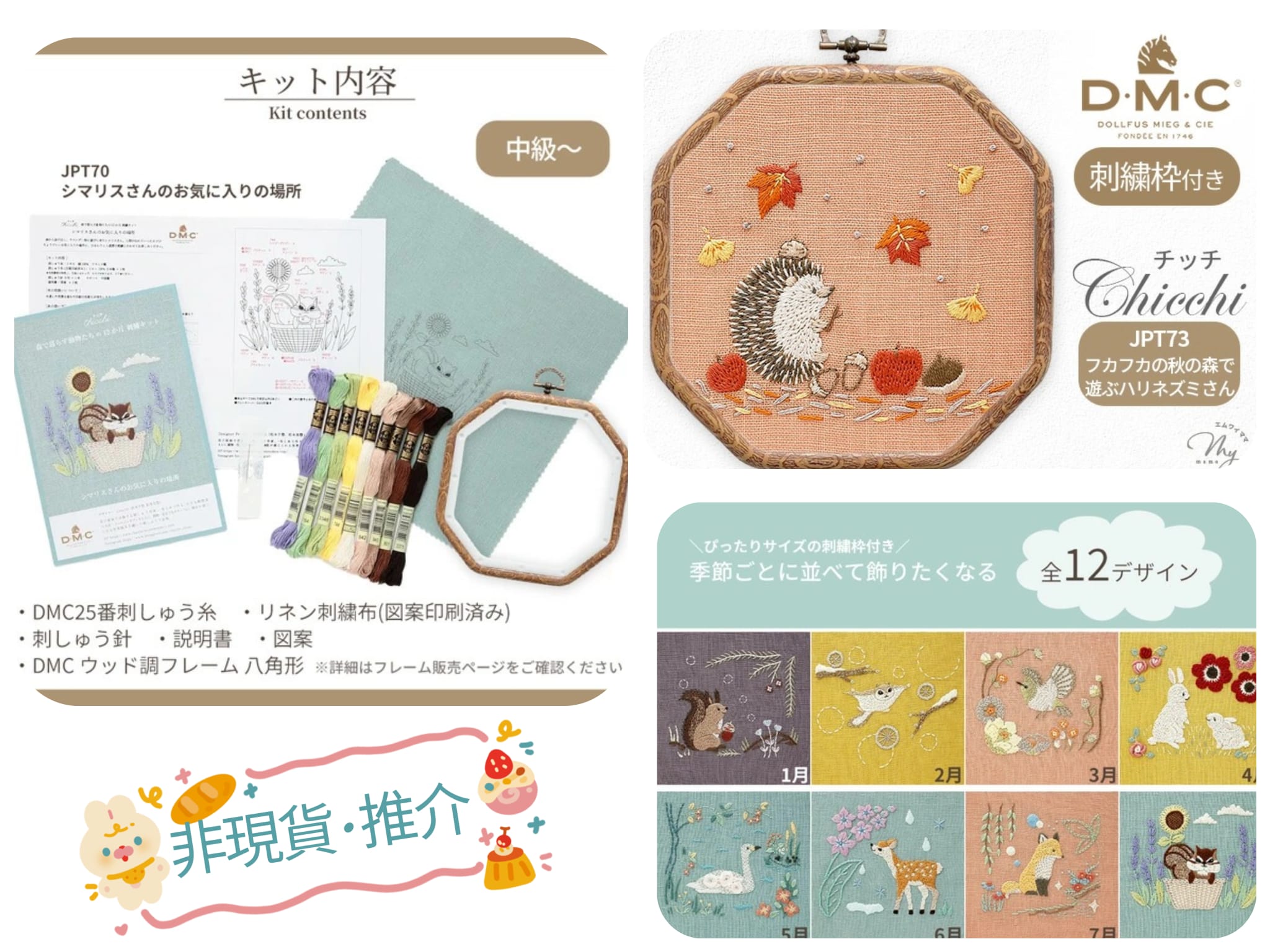 【1米 價格】🟩購自日本|💢 非 現貨|DMC刺繡套裝 (中級)|藝術家Chicchi 繡布,繡線,繡針 繡繃|12個月森林動物 - 8月 花栗鼠 [PJ-25-000125-8月 JPT70 花栗鼠]