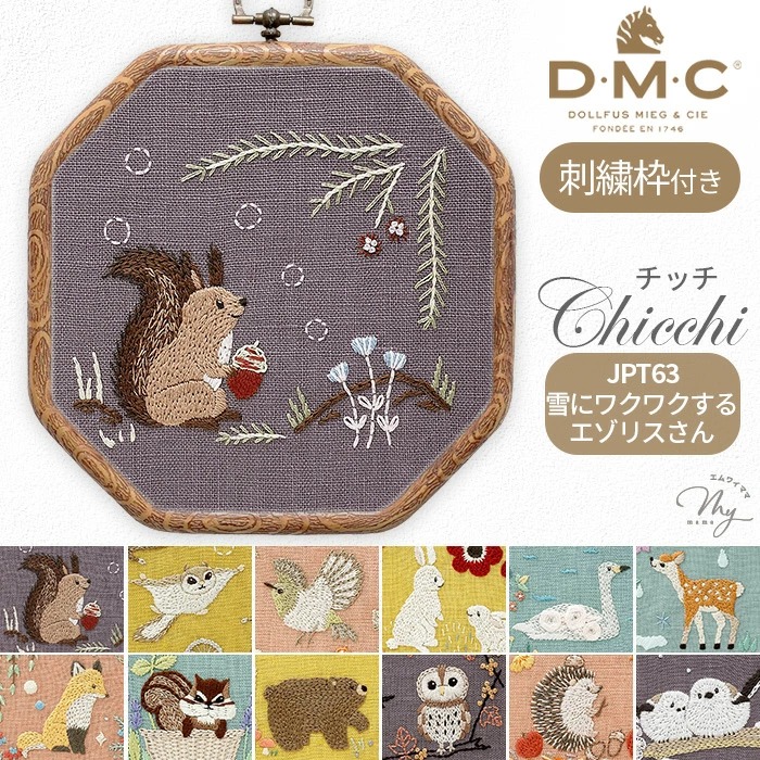 【1米 價格】🟩購自日本|💢 非 現貨|DMC刺繡套裝 (中級)|藝術家Chicchi 繡布,繡線,繡針 繡繃|12個月森林動物 - 1月 北海道松鼠